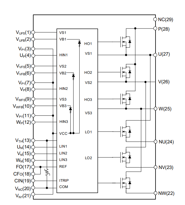 IPM29- SiC_MOS智能功率模塊新產(chǎn)品內(nèi)部集成了新一代N溝道增強(qiáng)型1200V-SiC_MOSFET芯片與與優(yōu)化的SOI工藝6通道柵極驅(qū)動(dòng)芯片,作為緊湊的1200V等級(jí)封裝,這款SiC MOSFET IPM使用簡便,針對(duì)SIC定制優(yōu)化驅(qū)動(dòng)部分,有效減小開關(guān)振蕩。此外,它采用緊湊式封裝,得益于使用具備很高熱導(dǎo)率的DBC基板,具有良好熱性能和充足的電氣隔離等級(jí)能力,具有出色的功率密度、可靠性和性能。它針對(duì)相關(guān)應(yīng)用進(jìn)行了優(yōu)化,是一款用于高效率的電機(jī)驅(qū)動(dòng)與有源功率校正電路的高效逆變平臺(tái)而設(shè)計(jì)的個(gè)性化產(chǎn)品。例如供暖通風(fēng)空調(diào),風(fēng)扇電機(jī),車載空調(diào)及三相功率因數(shù)校正。