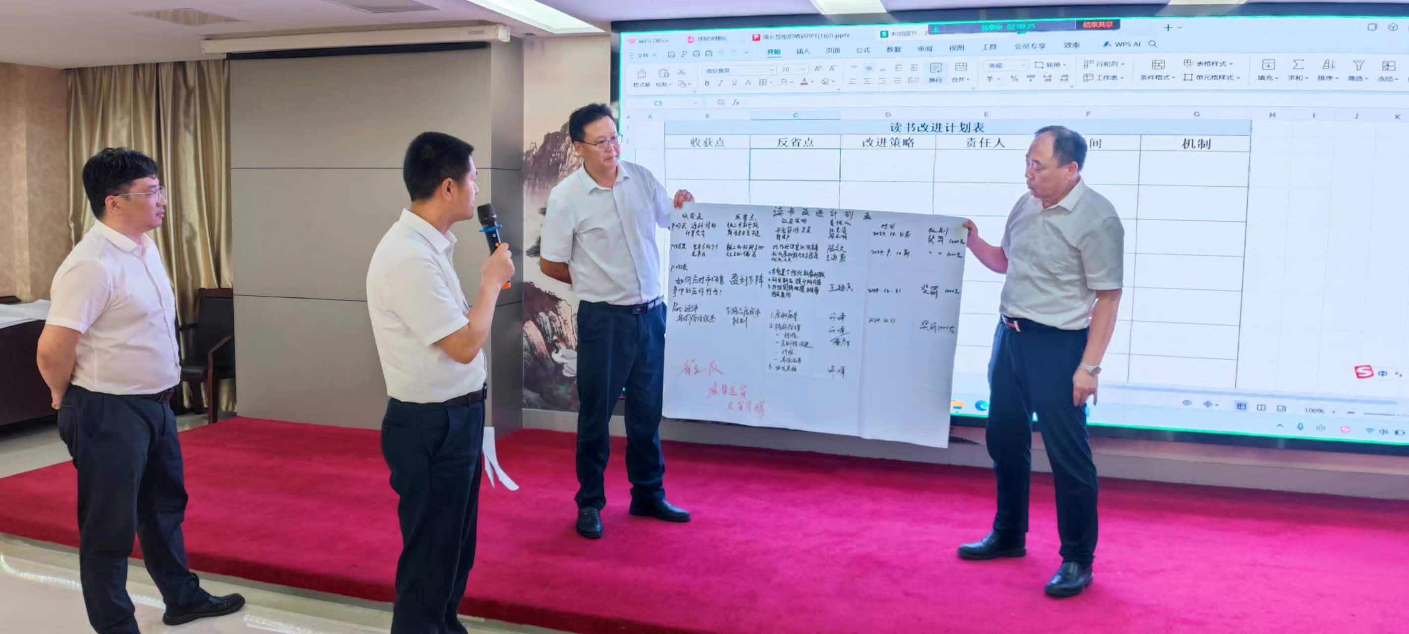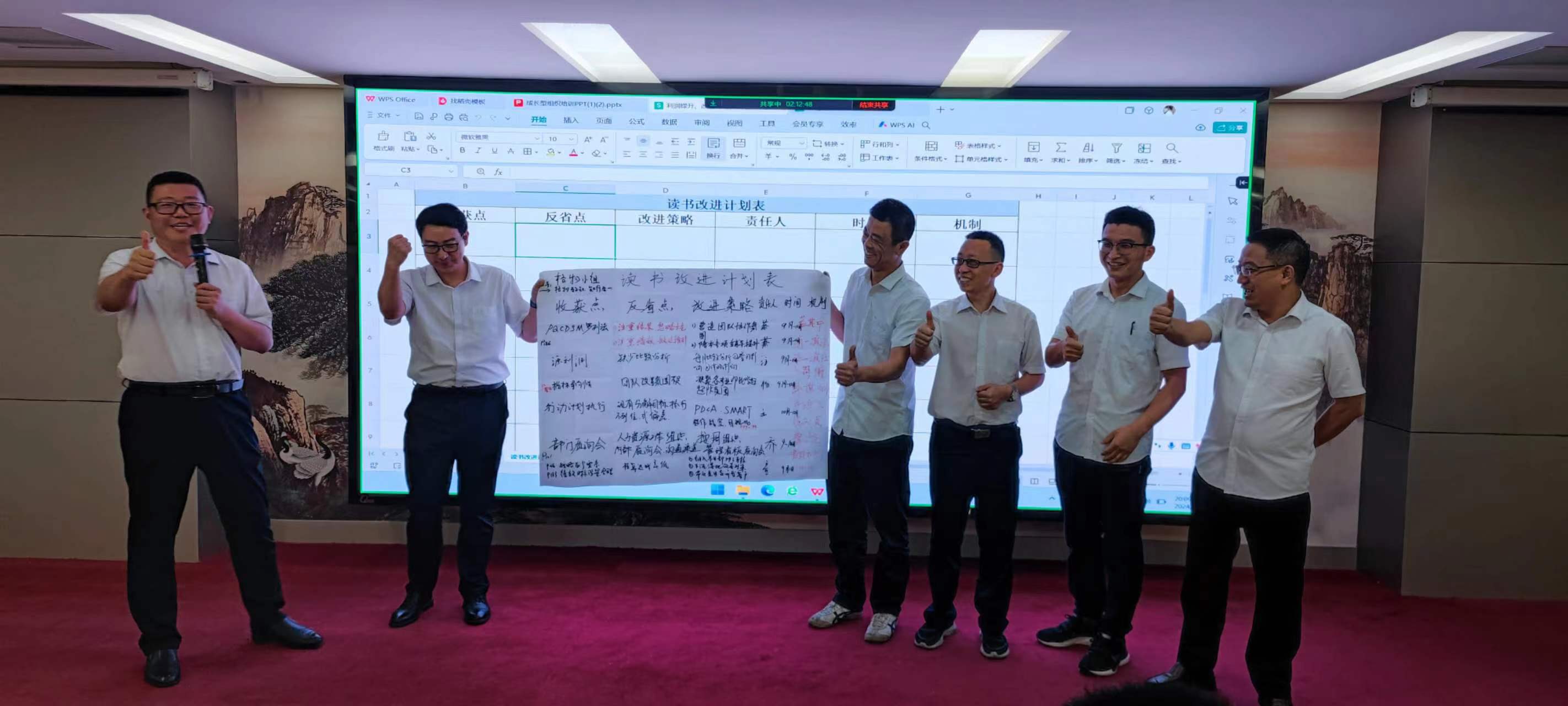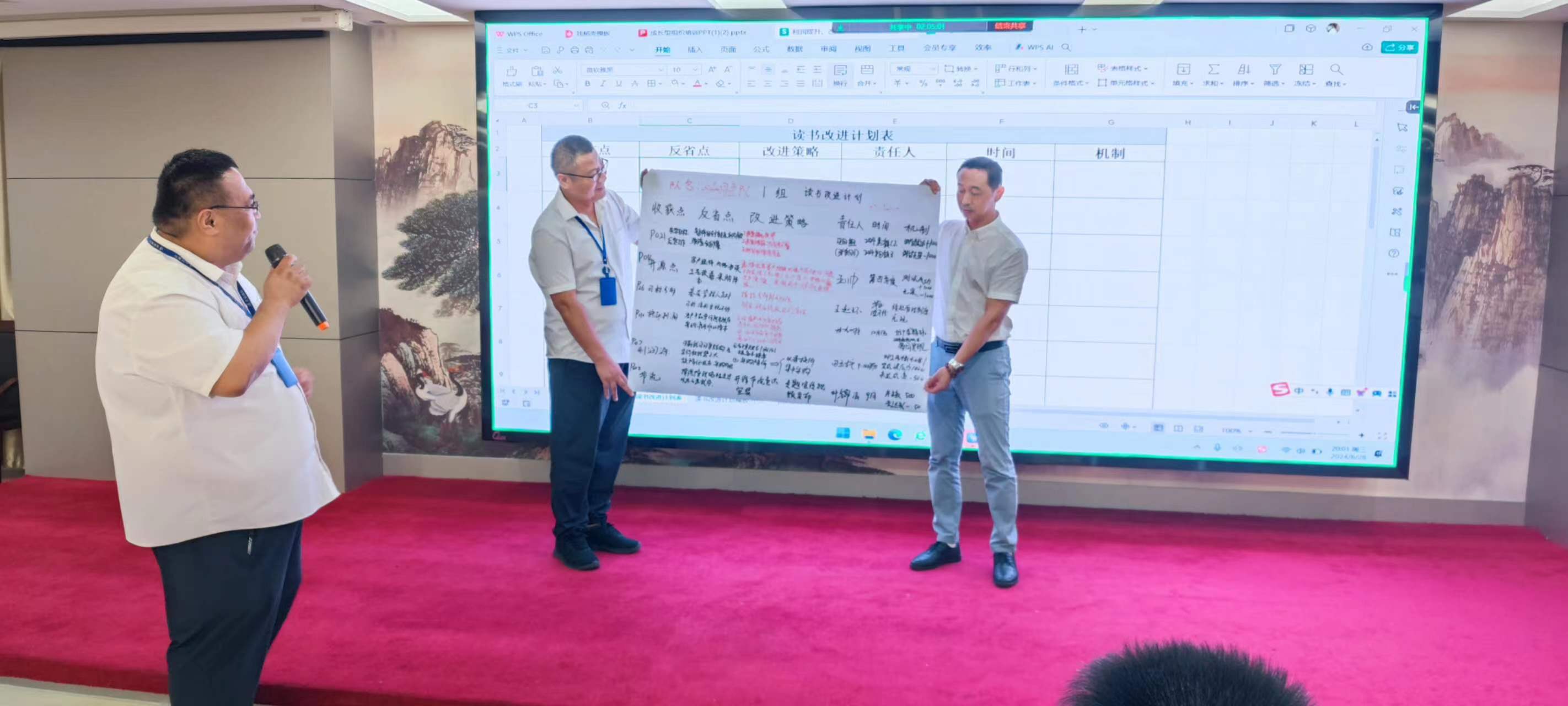 在交流環(huán)節(jié),每個小組組長分別上臺發(fā)表感言,所思、所想、所悟,并聯系實際工作中的不足與欠缺之處,以及有待解決或尚未發(fā)現的問題,大家暢所欲言,無不盡抒。每個小組根據收獲點、反省點、改進策略、責任人、時間、機制相關內容完成了本次學習的《讀書改進計劃表》,并上臺宣讀、講解、公示。
